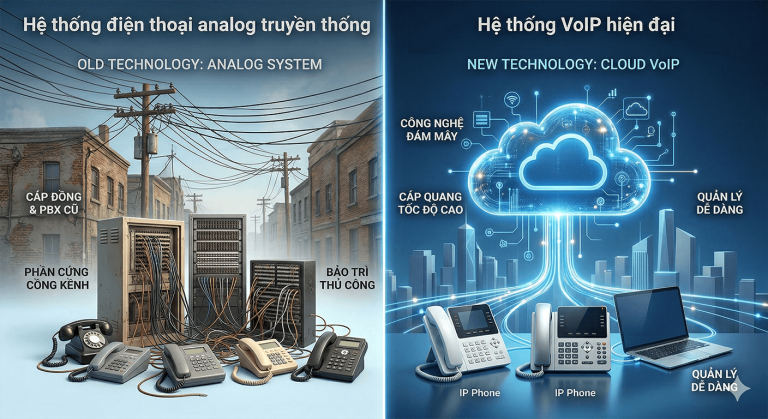 Trước sự chuyển đổi số mạnh mẽ như hiện nay, hệ thống tổng đài điện thoại không còn đơn thuần là công cụ liên lạc mà đã trở thành xương sống quan trọng cho giao tiếp nội bộ và chăm sóc khách hàng doanh nghiệp. Nhiều đơn vịvẫn đang băn khoăn giữa việc duy trì tổng đài Analog truyền thống hay chuyển sang tổng đài VoIP hiện đại.